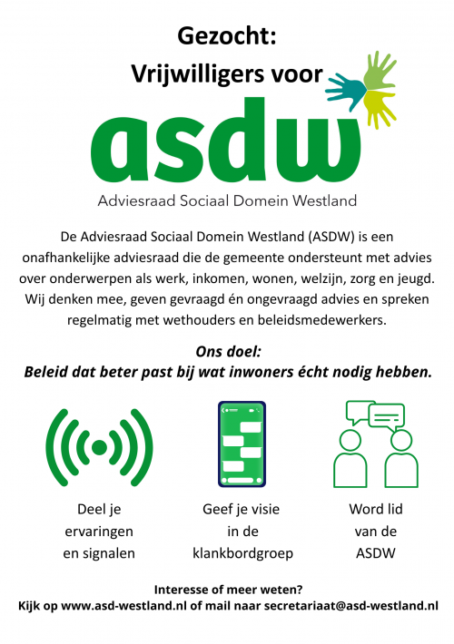 Bent je enthousiast geworden en wil je lid worden van de ASDW? Stuur dan je cv en korte motivatie naar secretariaat@asd-westland.nl. Heb je nog vragen over het lidmaatschap? Neem dan telefonisch contact op met onze voorzitter Nico van der Knaap: 06-53475224 of via eerdergenoemd mailadres. Er is ook meer informatie te vinden op: www.asd-westland.nl.